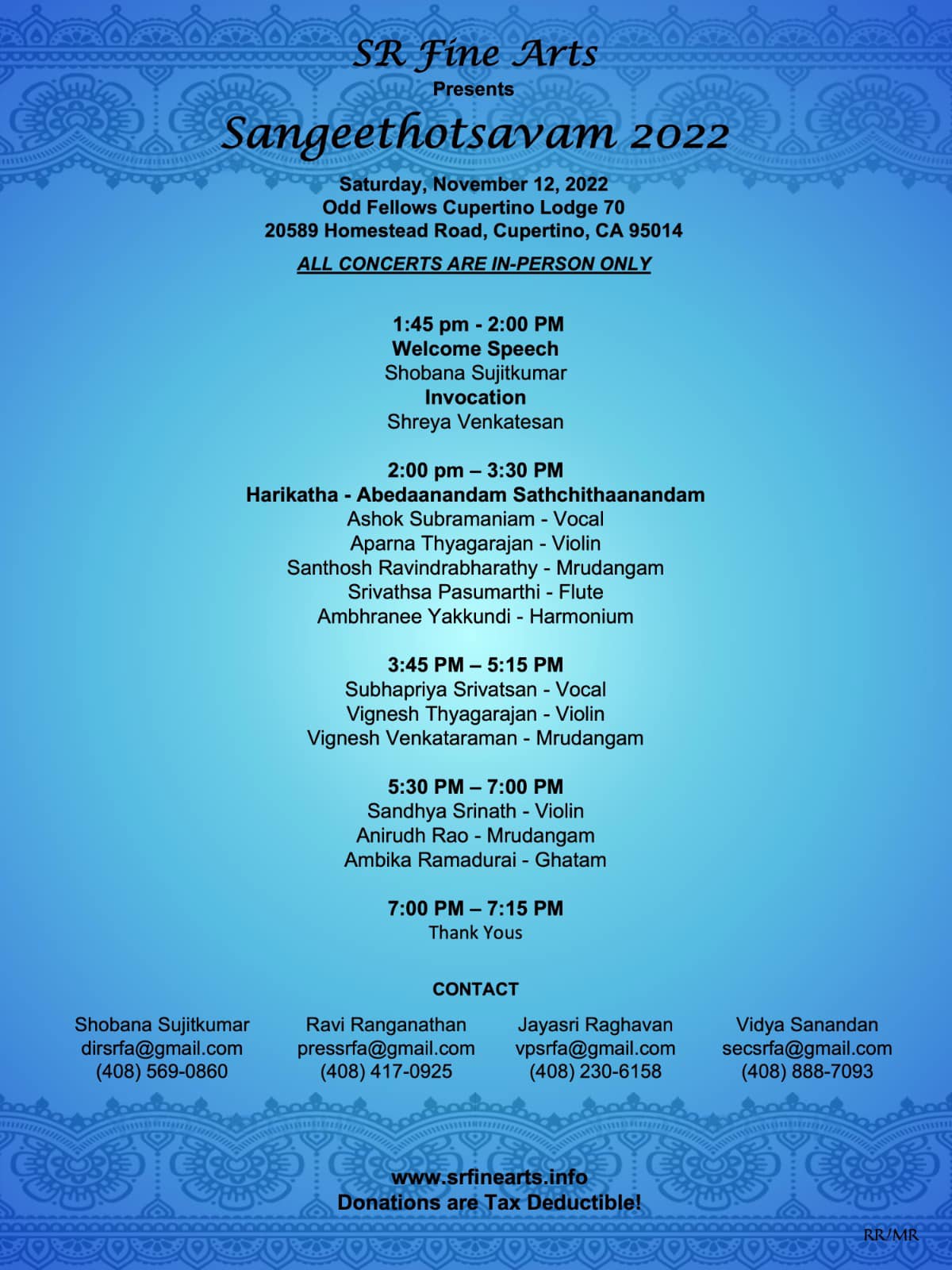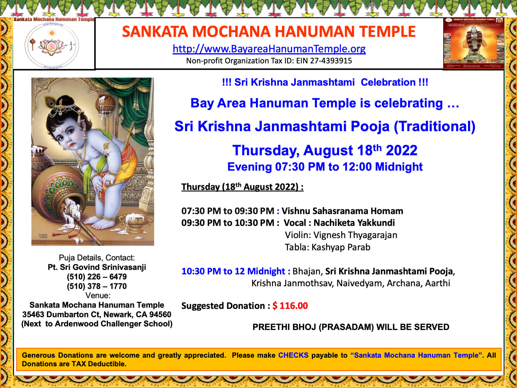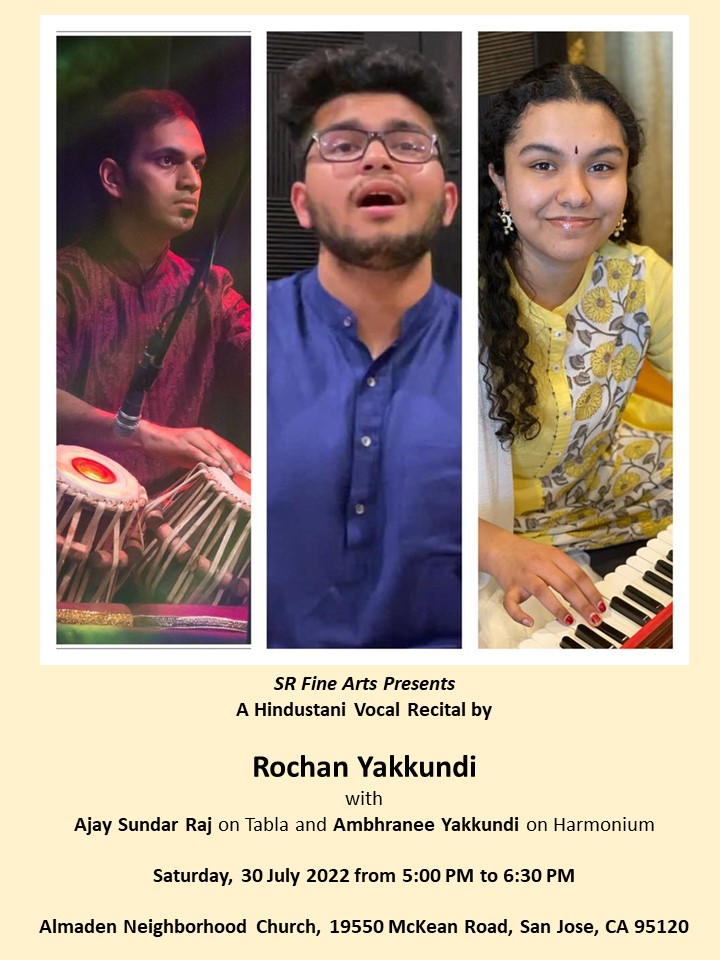 Janmaashtami concert; Sankata Mochana Hanuman Temple, 35463 Dumbarton Court, Newark, CA 94560; 9:30-10:30 PM; Kashyap Parab (T) and Vignesh Thyagarajan (V); this concert is free and open to everyone